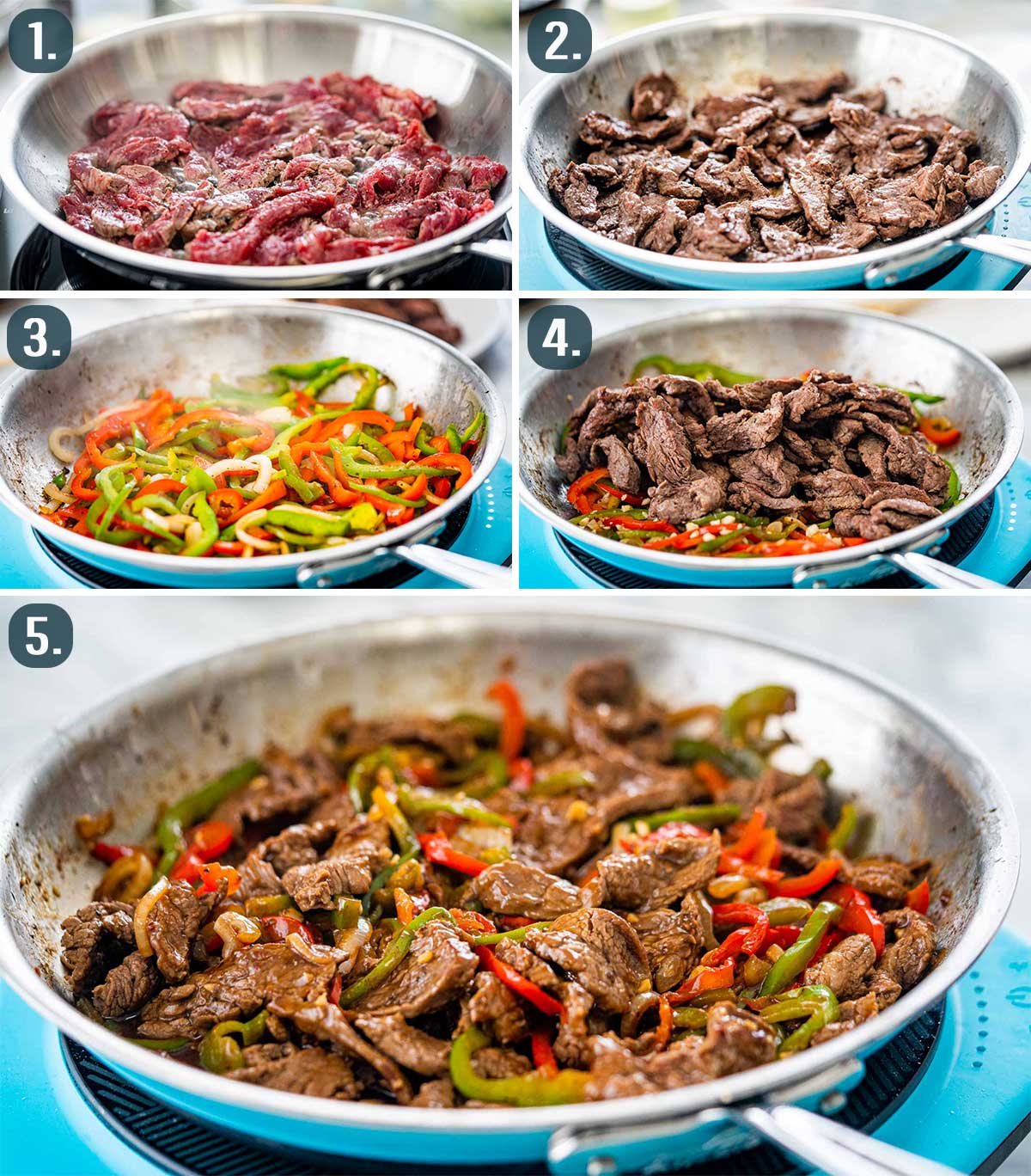 - Add 1 tablespoon of the vegetable oil to a skillet and heat over medium-high heat. Add the seasoned steak and spread it evenly in the skillet. Cook for 1 minute without touching it, then use a spatula to stir the meat around. Continue cooking for another minute then transfer to a plate.