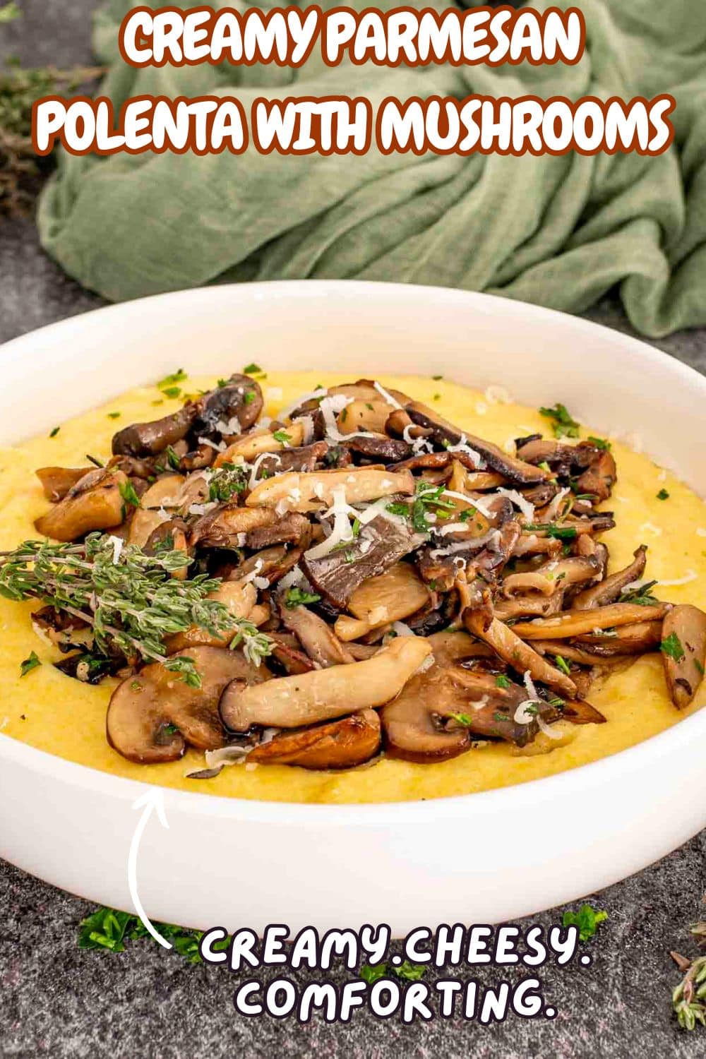 - It’s pure comfort. Creamy, cheesy, buttery polenta topped with garlicky mushrooms. Every bite feels like a warm hug.