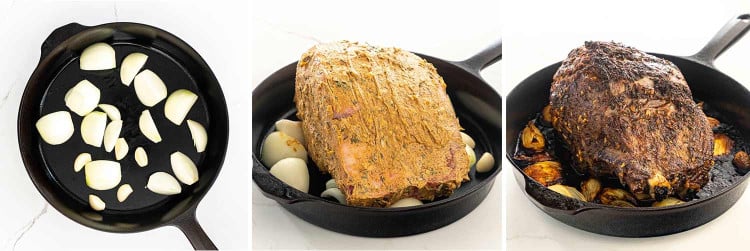 - Place the onions, garlic, thyme and rosemary in a large skillet that will fit your roast. If you don't have a large enough skillet, use a roasting pan. Place the roast over the onions in the skillet.